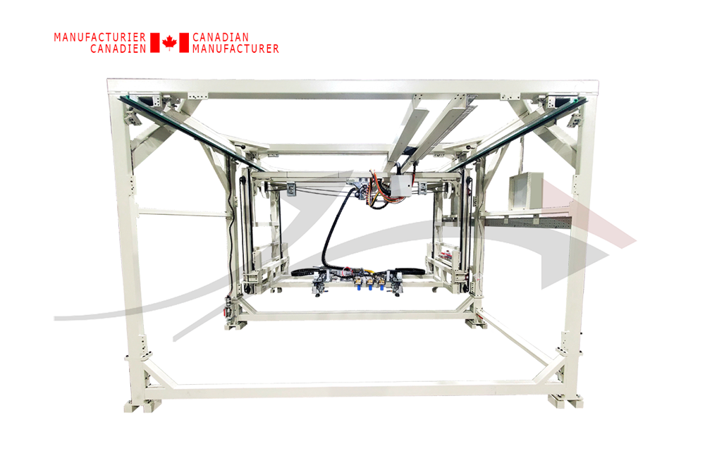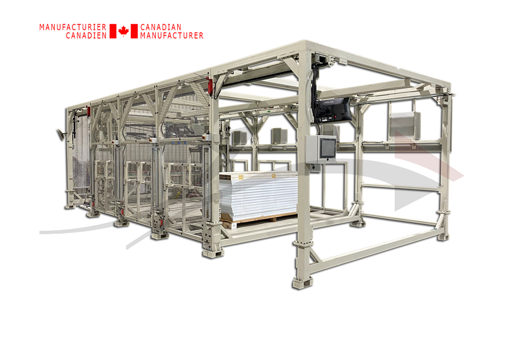 • Mouvement de positionnement 3 axes, incluant 2 lecteurs laser pour le système de ventouse permettant au système de se positionner automatiquement selon l’emplacement des embossures sur les panneaux. Ce même système gère les tolérances des panneaux pour leur positionnement mais aussi sur l’épaisseur.